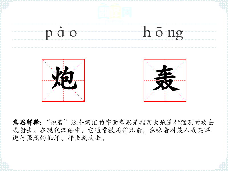 “炮轰”这个词汇的字面意思是指用大炮进行猛烈的攻击或射击。在现代汉语中,它通常被用作比喻,意味着对某人或某事进行强烈的批评、抨击或攻击。