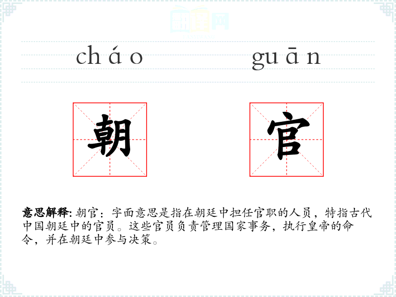 朝官:字面意思是指在朝廷中担任官职的人员,特指古代朝廷中的官员。这些官员负责管理国家事务,执行的命令,并在朝廷中参与决策。