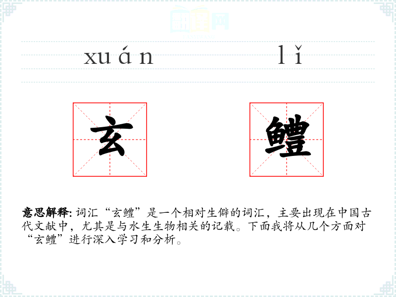 词汇“玄鳢”是一个相对生僻的词汇,主要出现在*古代文献中,尤其是与水生生物相关的记载。下面我将从几个方面对“玄鳢”进行深入学和分析。