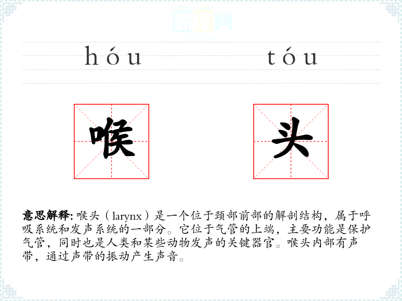 在不同语言中,“喉头”通常有对应的词汇,如英语中的“larynx”,法语中的“larynx”,德语中的“Larynx”等,这些词汇都源自拉丁语,反映了医学术语的国际化。