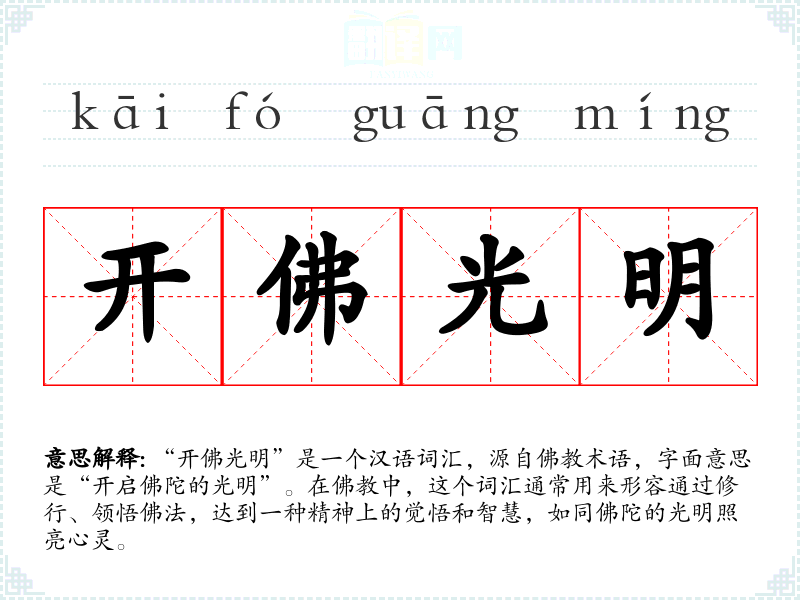 “开佛光明”是一个汉语词汇,源自术语,字面意思是“开启佛陀的光明”。在中,这个词汇通常用来形容通过修行、领悟佛法,达到一种精神上的觉悟和智慧,如同佛陀的光明照亮心灵。
