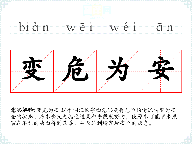 变危为安 这个词汇的字面意思是将危险的情况转变为安全的状态。基本含义是指通过某种手段或努力,使原本可能带来危害或不利的局面得到改善,从而达到稳定和安全的状态。