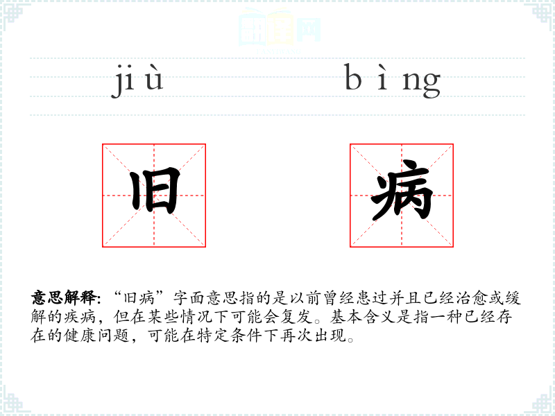 “旧病”字面意思指的是以前曾经患过并且已经治愈或缓解的疾病,但在某些情况下可能会复发。基本含义是指一种已经存在的健康问题,可能在特定条件下再次出现。