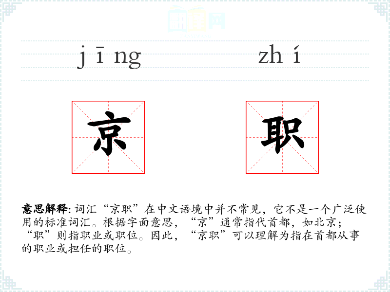 词汇“京职”在中文语境中并不常见,它不是一个广泛使用的标准词汇。根据字面意思,“京”通常指代首都,如北京;“职”则指职业或职位。因此,“京职”可以理解为指在首都从事的职业或担任的职位。