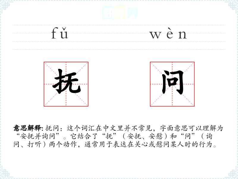 抚问:这个词汇在中文里并不常见,字面意思可以理解为“安抚并询问”。它结合了“抚”(安抚、安慰)和“问”(询问、打听)两个动作,通常用于表达在关心或慰问某人时的行为。