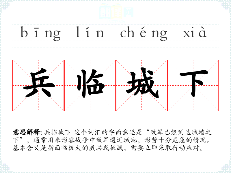 兵临城下 这个词汇的字面意思是“敌军已经到达城墙之下”,通常用来形容战争中敌军逼近城池,形势十分危急的情况。基本含义是指面临极大的威胁或挑战,需要立即采取行动应对。