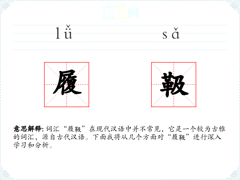 词汇“履靸”在现代汉语中并不常见,它是一个较为古雅的词汇,源自古代汉语。下面我将从几个方面对“履靸”进行深入学*和分析。