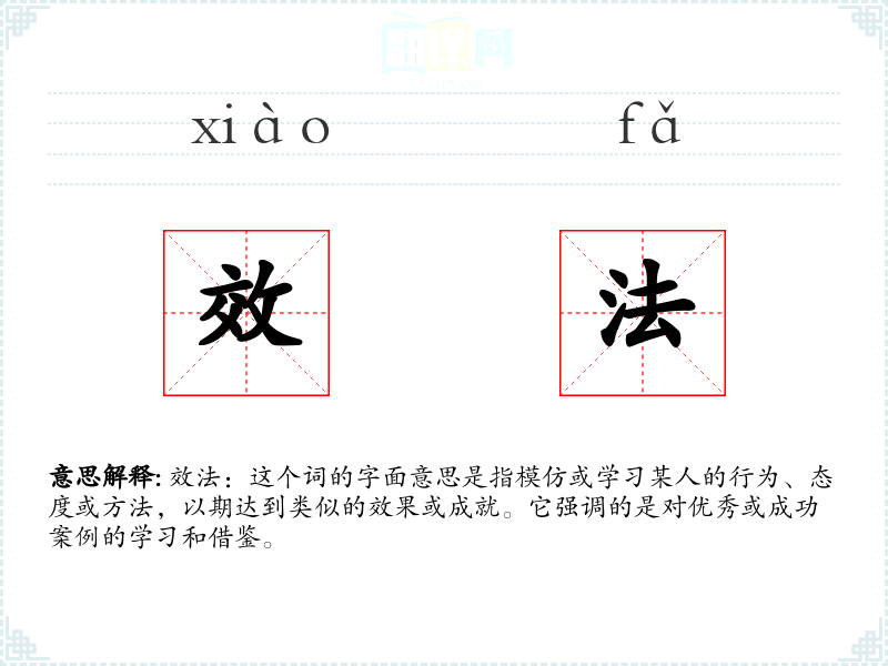 效法:这个词的字面意思是指模仿或学某人的行为、态度或方法,以期达到类似的效果或成就。它强调的是对优秀或成功案例的学和借鉴。