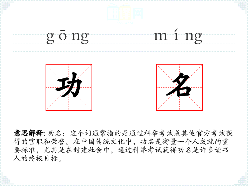 功名:这个词通常指的是通过科举考试或其他官方考试获得的官职和荣誉。在**传统文化中,功名是衡量一个人成就的重要标准,尤其是在封建社会中,通过科举考试获得功名是许多读书人的终极目标。