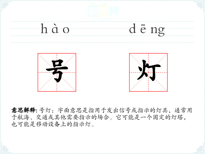 号灯:字面意思是指用于发出信号或指示的灯具,通常用于航海、交通或其他需要指示的场合。它可能是一个固定的灯塔,也可能是移动设备上的指示灯。