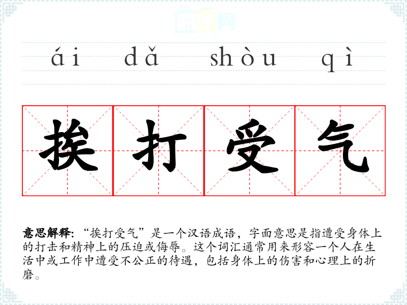 “挨打受气”是一个汉语成语,字面意思是指遭受身体上的打击和精神上的压迫或侮辱。这个词汇通常用来形容一个人在生活中或工作中遭受不公正的待遇,包括身体上的伤害和心理上的折磨。