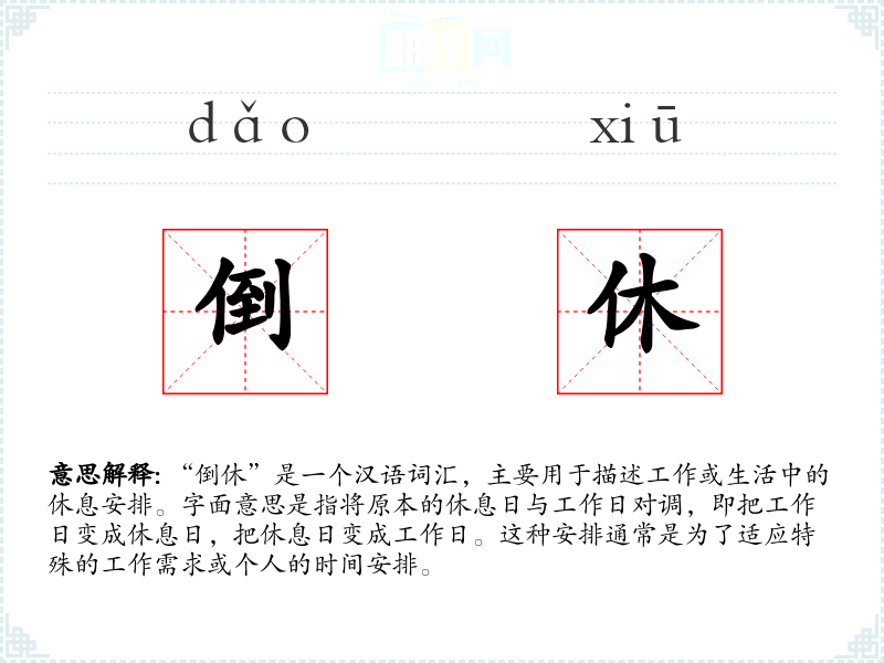 “倒休”是一个汉语词汇,主要用于描述工作或生活中的休息安排。字面意思是指将原本的休息日与工作日对调,即把工作日变成休息日,把休息日变成工作日。这种安排通常是为了适应特殊的工作需求或个人的时间安排。