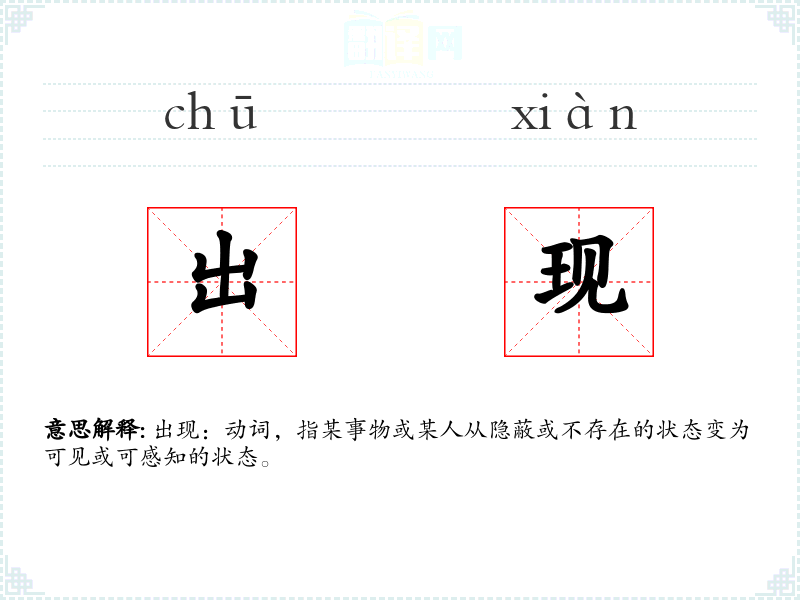 出现:动词,指某事物或某人从隐蔽或不存在的状态变为可见或可感知的状态。