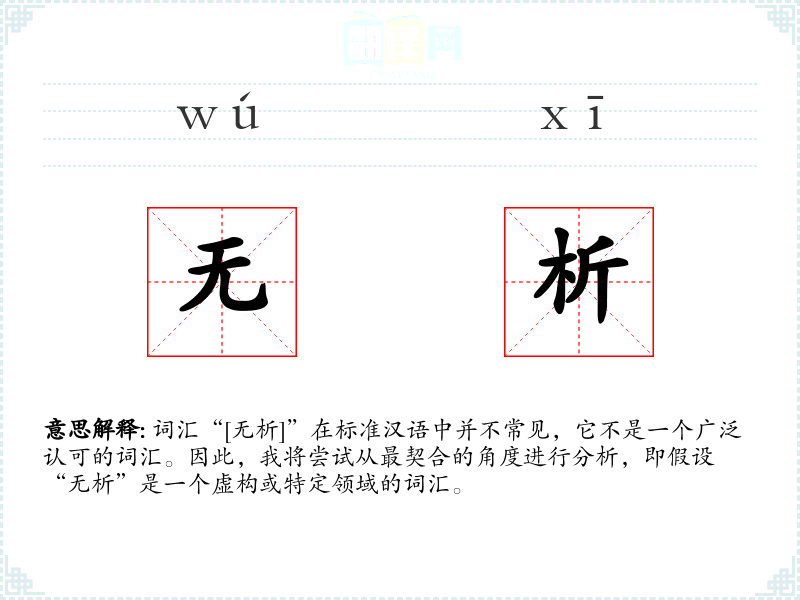 词汇“[无析]”在标准汉语中并不常见,它不是一个广泛认可的词汇。因此,我将尝试从最契合的角度进行分析,即假设“无析”是一个虚构或特定领域的词汇。