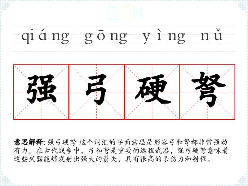 在古代,弓弩是重要的军事装备,强弓硬弩** 反映了当时对武器制造和使用的重视。这个词汇也体现了古代战争文化的特点,即强调武器的实用性和威力。