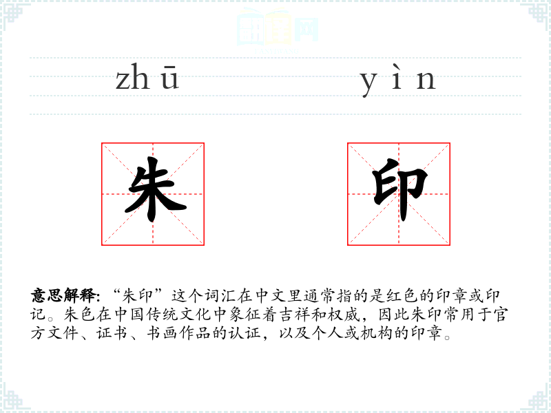 - 口语:在日常对话中,朱印可能简单指代红色的印章,如“请在文件上盖朱印”。