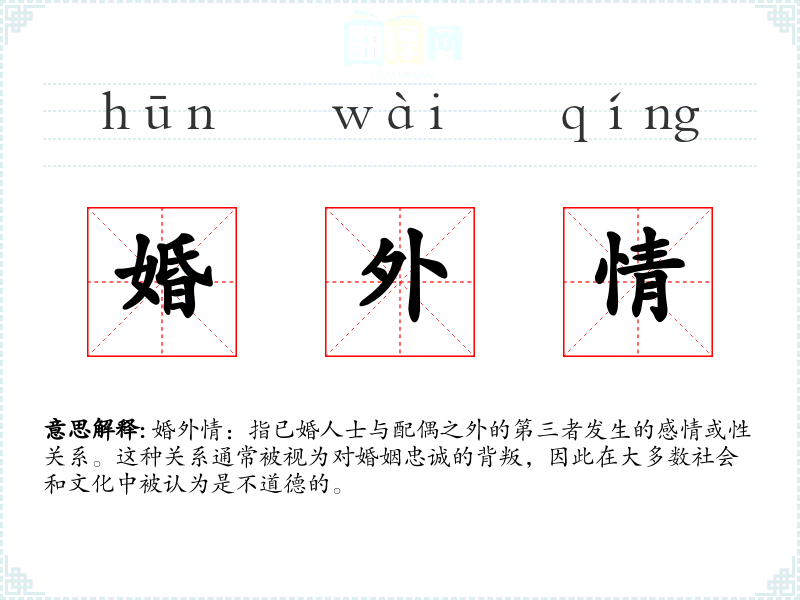 婚外情是一个复杂且敏感的词汇,它不仅涉及个人情感和道德选择,还反映了社会和文化对婚姻和忠诚的看法。在语言学习和表达中,理解和恰当使用这个词对于把握人际关系的微妙之处至关重要。