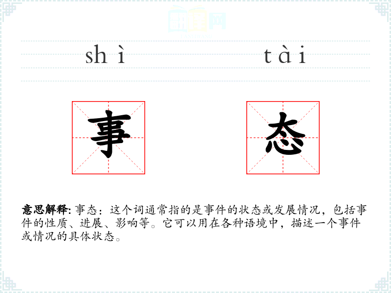 - 同义词:情况、局势、状况。这些词在描述状态时与“事态”相似,但“事态”更侧重于的发展和变化。