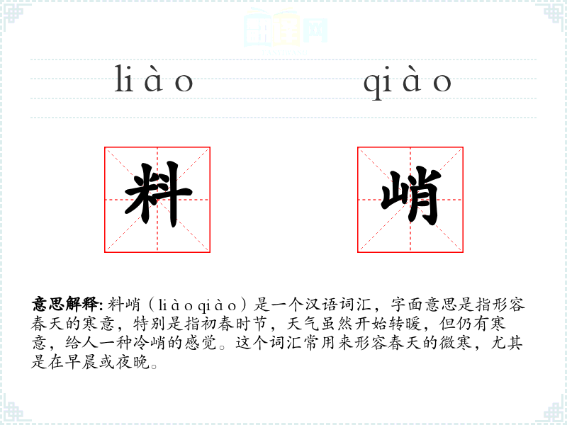 文学语境:在文学作品中,“料峭”常用来描绘春天的景象,增添一种诗意和美感。例如,“料峭春风吹酒醒”(苏轼《江城子·乙卯正月二十日夜记梦》)。