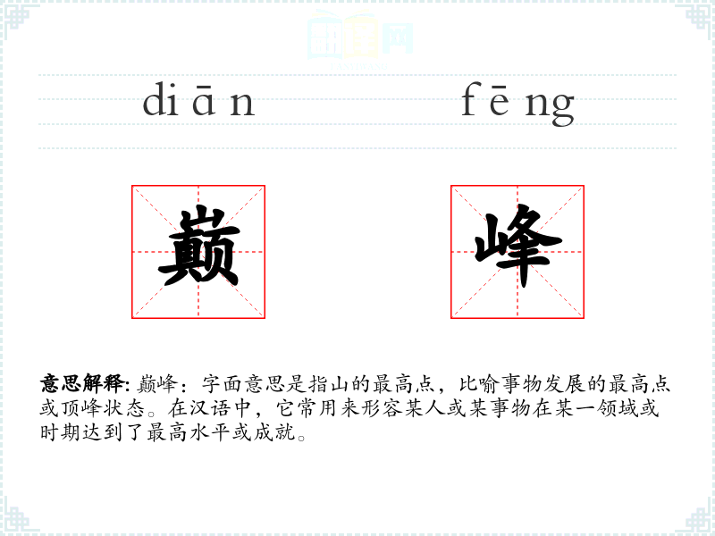巅峰:字面意思是指山的最高点,比喻事物发展的最高点或顶峰状态。在汉语中,它常用来形容某人或某事物在某一领域或时期达到了最高水平或成就。