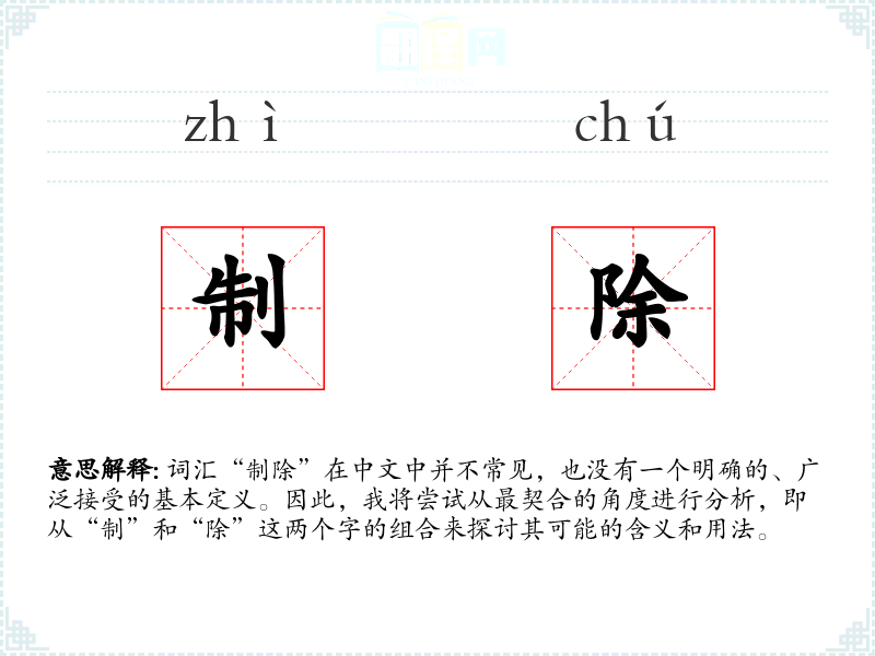 “制”通常有控制、约束、制造等含义,而“除”则有去除、消除、除外等含义。结合起来,“制除”可能意味着通过某种手段或方法去除或消除某事物。