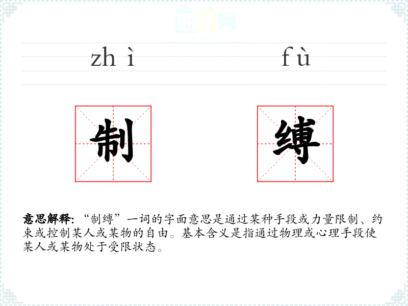 “制缚”一词的字面意思是通过某种手段或力量限制、约束或控制某人或某物的自由。基本含义是指通过物理或心理手段使某人或某物处于受限状态。