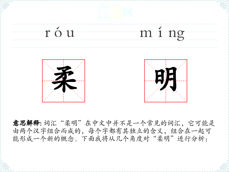 “柔明”作为一个组合词汇,其含义可能因语境而异。在语言学习和表达中,它可以用来丰富描述的层次,增加语言的细腻度和美感。虽然它不是一个常用词汇,但在特定的语境中,它可以有效地传达特定的情感和氛围。