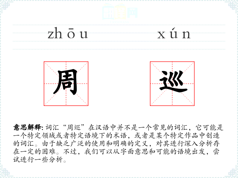 “周巡”字面意思可能是指“环绕巡视”或“周而复始的巡查”。其中,“周”可以理解为环绕、周围,“巡”则是巡视、巡查的意思。