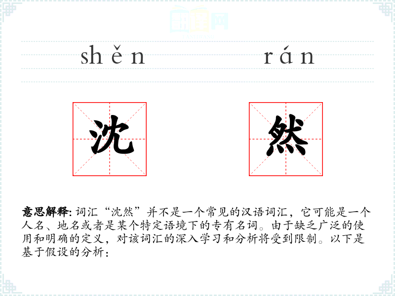 - 总结:由于“沈然”不是一个标准词汇,对其的分析受到限制。如果它是一个特定语境下的专有名词,了解其具体含义和使用背景将有助于更深入的分析。