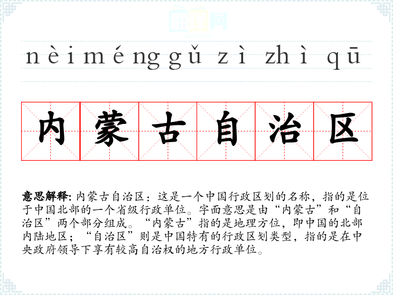 内蒙古自治区:这是一个行政区划的名称,指的是位于北部的一个省级行政单位。字面意思是由“内蒙古”和“自治区”两个部分组成。“内蒙古”指的是地理方位,即的北部内陆地区;“自治区”则是特有的行政区划类型,指的是在中央政府领导下享有较高自治权的地方行政单位。