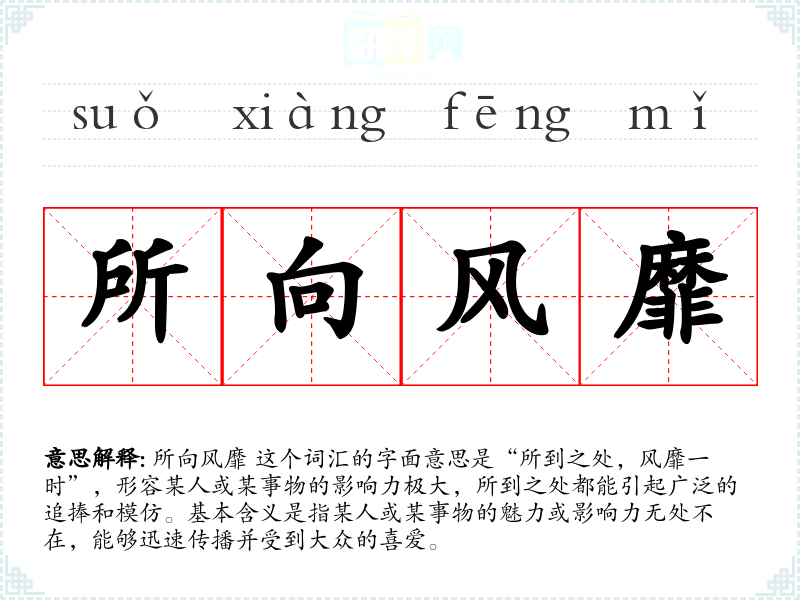 所向风靡 这个词汇的字面意思是“所到之处,风靡一时”,形容某人或某事物的影响力极大,所到之处都能引起广泛的追捧和模仿。基本含义是指某人或某事物的魅力或影响力无处不在,能够迅速传播并受到大众的喜爱。
