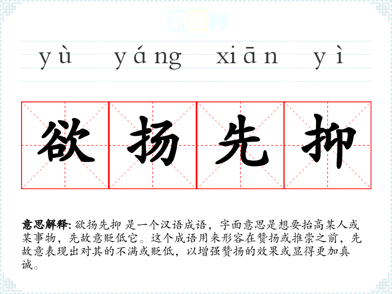欲扬先抑 是一个汉语成语,字面意思是想要抬高某人或某事物,先故意贬低它。这个成语用来形容在赞扬或推崇之前,先故意表现出对其的不满或贬低,以增强赞扬的效果或显得更加真诚。