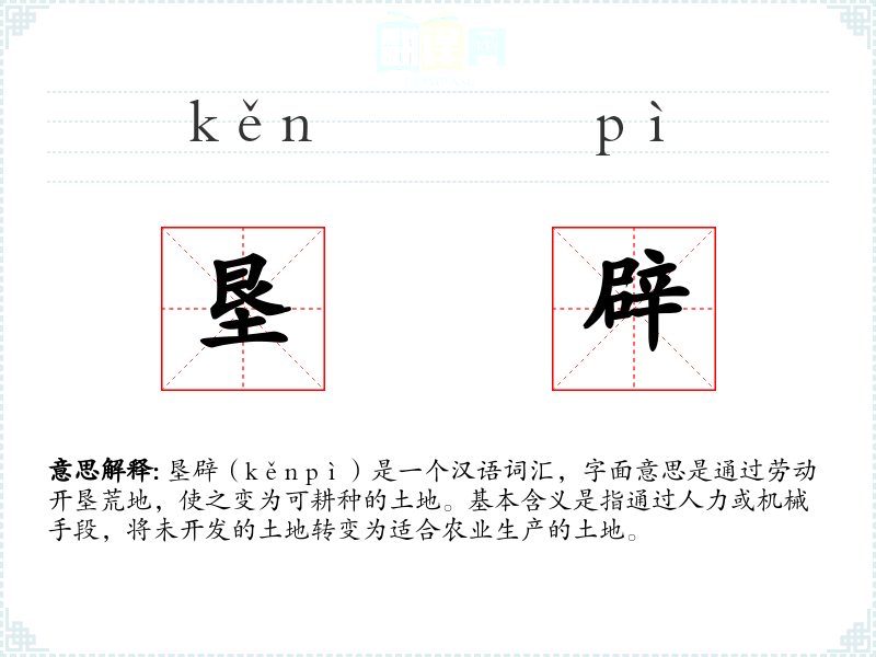 垦辟(kěn pì)是一个汉语词汇,字面意思是通过劳动开垦荒地,使之变为可耕种的土地。基本含义是指通过人力或机械手段,将未开发的土地转变为适合农业生产的土地。