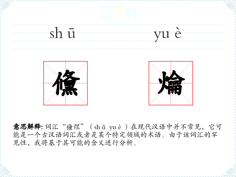 词汇“儵煜”(shū yuè)在现代汉语中并不常见,它可能是一个古汉语词汇或者是某个特定领域的术语。由于该词汇的罕见性,我将基于其可能的含义进行分析。