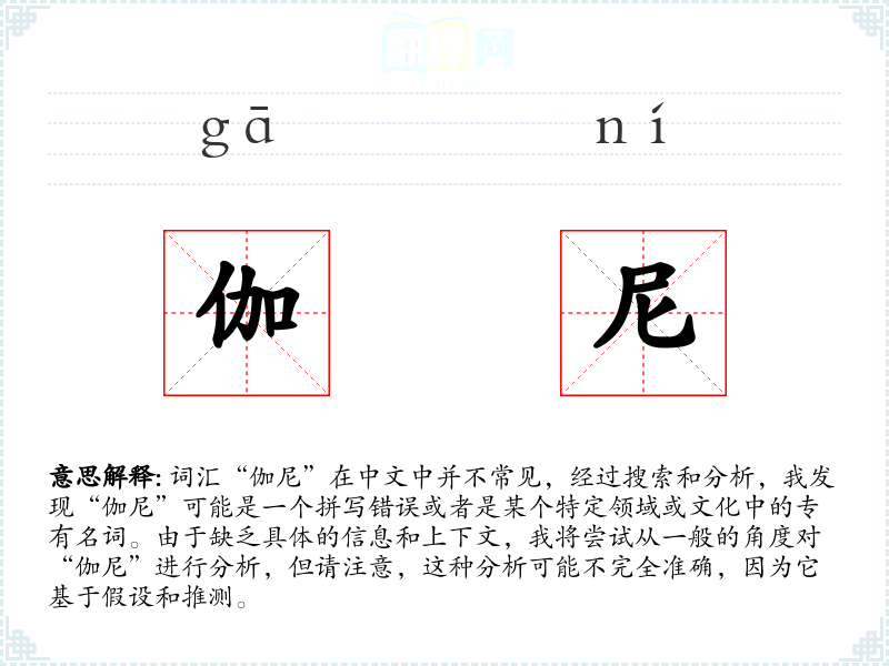 词汇“伽尼”在中文中并不常见,经过搜索和分析,我发现“伽尼”可能是一个拼写错误或者是某个特定领域或文化中的专有名词。由于缺乏具体的信息和上下文,我将尝试从一般的角度对“伽尼”进行分析,但请注意,这种分析可能不完全准确,因为它基于假设和推测。