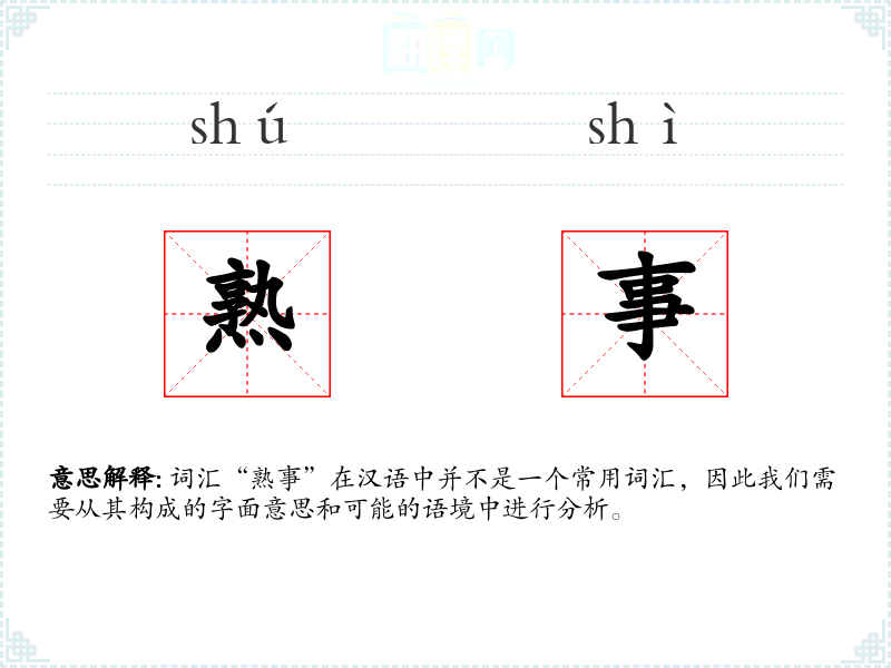 词汇“熟事”在汉语中并不是一个常用词汇,因此我们需要从其构成的字面意思和可能的语境中进行分析。