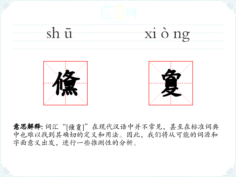 “儵敻”可能是由两个汉字组合而成的词汇,但由于缺乏确切的文献记载,我们无法给出其确切的字面意思和基本含义。从字面上看,“儵”可能与“迅速”或“突然”有关,而“敻”则可能与“遥远”或“深邃”有关。