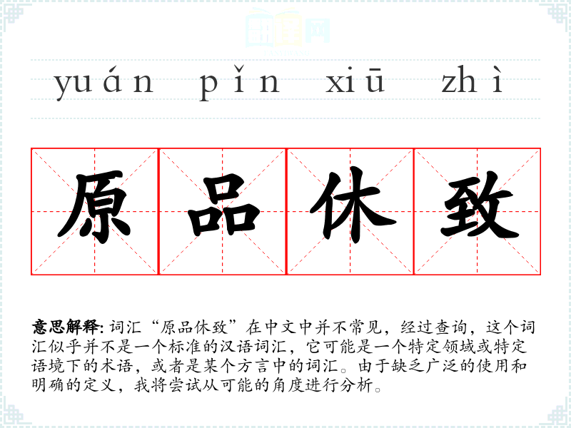 词汇“原品休致”在中文中并不常见,经过查询,这个词汇似乎并不是一个标准的汉语词汇,它可能是一个特定领域或特定语境下的术语,或者是某个方言中的词汇。由于缺乏广泛的使用和明确的定义,我将尝试从可能的角度进行分析。