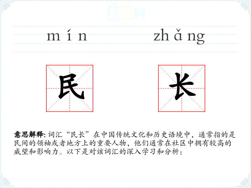 词汇“民长”在*传统文化和历史语境中,通常指的是民间的领袖或者地方上的重要人物,他们通常在社区中拥有较高的威望和影响力。以下是对该词汇的深入学和分析: