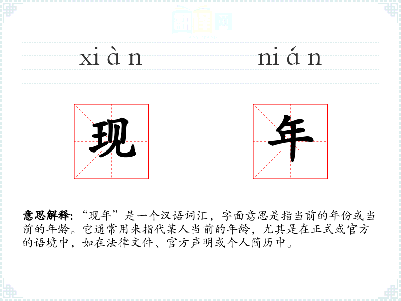 “现年”是一个汉语词汇,字面意思是指当前的年份或当前的年龄。它通常用来指代某人当前的年龄,尤其是在正式或官方的语境中,如在法律文件、官方声明或个人简历中。