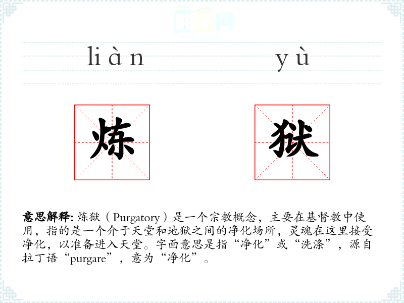 炼狱(Purgatory)是一个概念,主要在教中使用,指的是一个介于天堂和地狱之间的净化场所,灵魂在这里接受净化,以准备进入天堂。字面意思是指“净化”或“洗涤”,源自拉丁语“purgare”,意为“净化”。