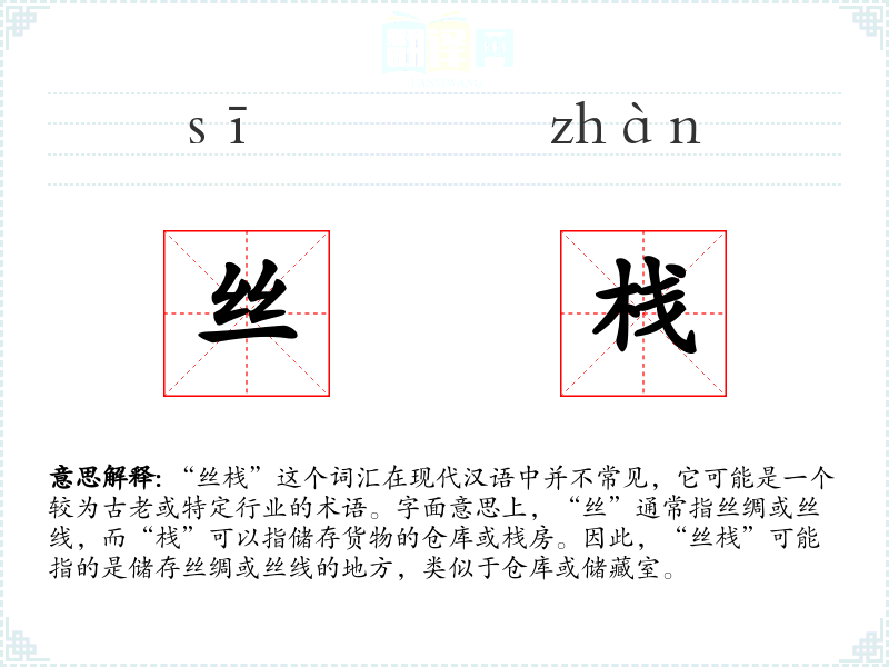 - 反义词:(由于“丝栈”是一个特定且不常见的词汇,反义词可能不太适用)