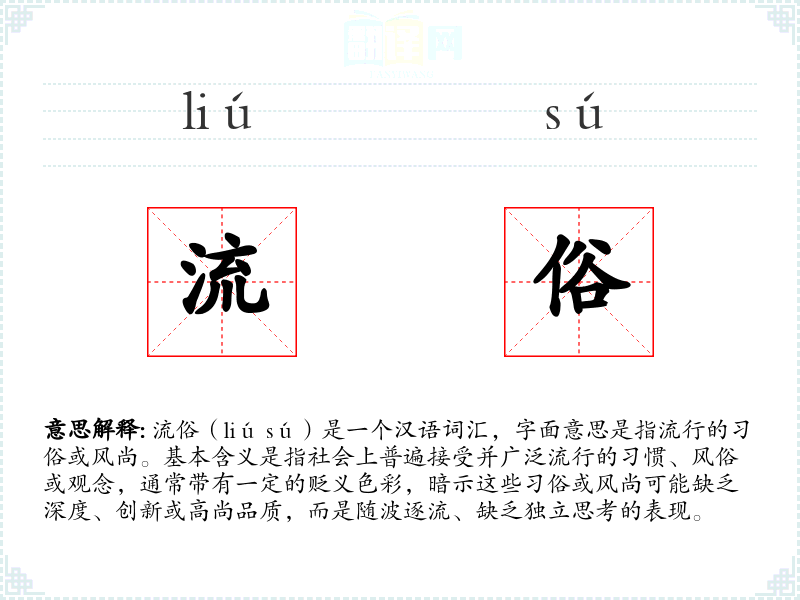 流俗(liú sú)是一个汉语词汇,字面意思是指流行的习俗或风尚。基本含义是指社会上普遍接受并广泛流行的习惯、风俗或观念,通常带有一定的贬义色彩,暗示这些习俗或风尚可能缺乏深度、创新或高尚品质,而是随波逐流、缺乏独立思考的表现。