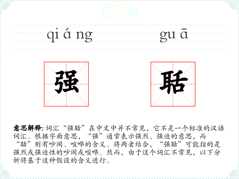 词汇“强聒”在中文中并不常见,它不是一个标准的汉语词汇。根据字面意思,“强”通常表示强烈、强迫的意思,而“聒”则有吵闹、喧哗的含义。将两者结合,“强聒”可能指的是强烈或强迫性的吵闹或喧哗。然而,由于这个词汇不常见,以下分析将基于这种假设的含义进行。
