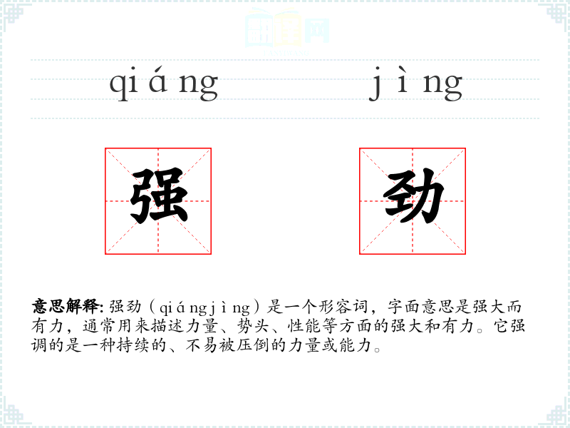 强劲(qiáng jìng)是一个形容词,字面意思是强大而有力,通常用来描述力量、势头、性能等方面的强大和有力。它强调的是一种持续的、不易被压倒的力量或能力。