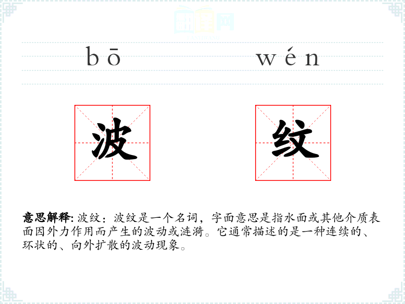 波纹:波纹是一个名词,字面意思是指水面或其他介质表面因外力作用而产生的波动或涟漪。它通常描述的是一种连续的、环状的、向外扩散的波动现象。