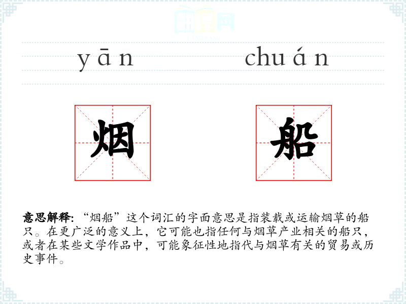 “烟船”这个词汇的字面意思是指装载或运输烟草的船只。在更广泛的意义上,它可能也指任何与烟草产业相关的船只,或者在某些文学作品中,可能象征性地指代与烟草有关的贸易或历史**。