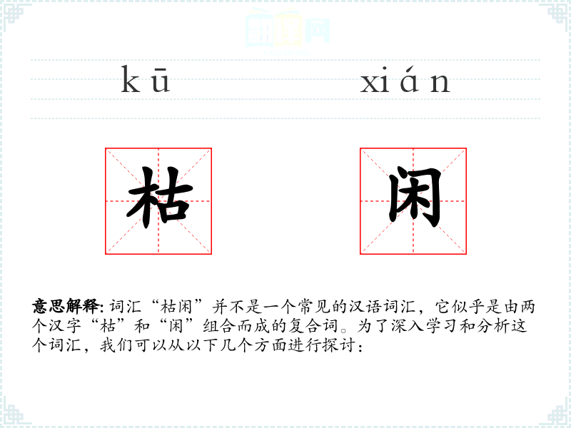 词汇“枯闲”并不是一个常见的汉语词汇,它似乎是由两个汉字“枯”和“闲”组合而成的复合词。为了深入学习和分析这个词汇,我们可以从以下几个方面进行探讨: