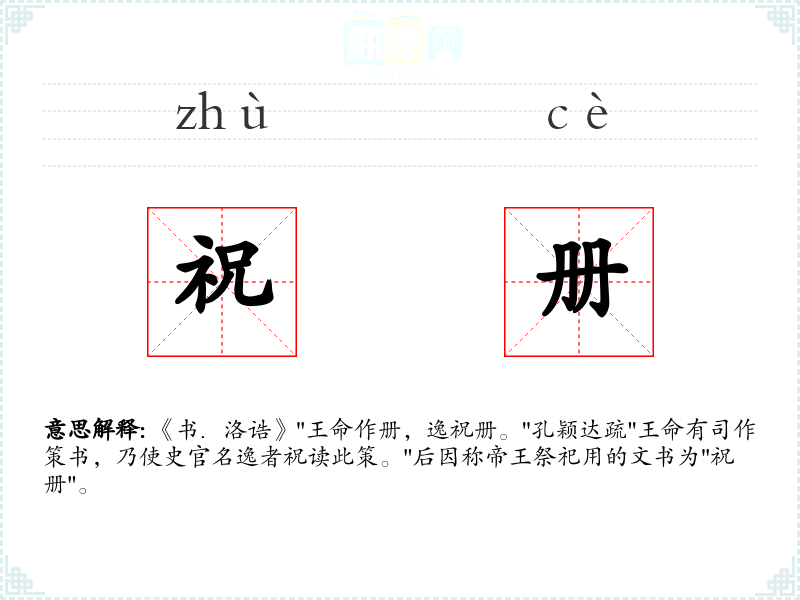 《书.洛诰》"王命作册,逸祝册。"孔颖达疏"王命有司作策书,乃使史官名逸者祝读此策。"后因称帝王祭祀用的文书为"祝册"。