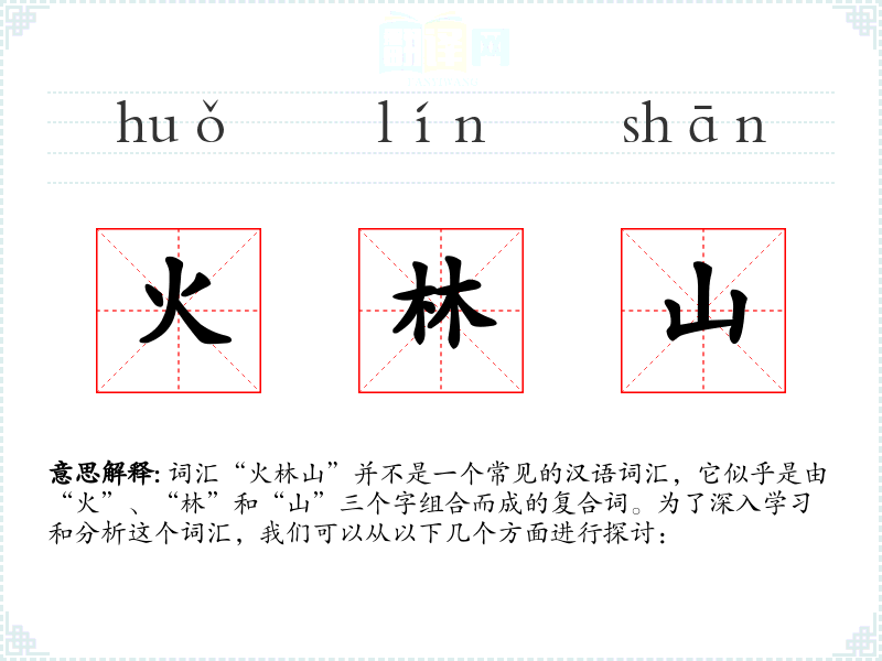 - 词源:这个词汇可能是由“火”、“林”和“山”三个字直接组合而成,没有特定的历史演变。